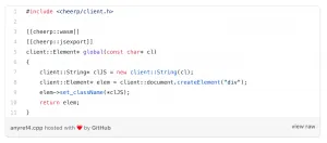 This allows Cheerp to compile C++ code to regular JavaScript, and interoperate easily with JavaScript libraries (including the native browser APIs). It is also possible to mix and match these two representations and choose one or the other for any declared struct/class.